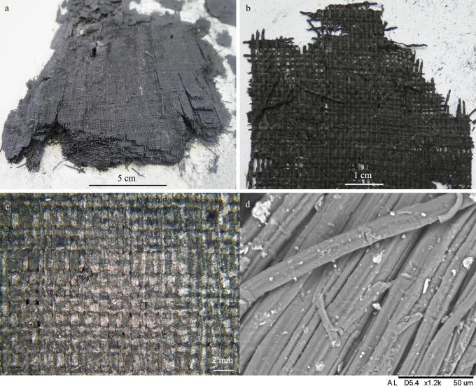Numerous layers of fabric are preserved, stacked tidily on top of one another. The threads appear extremely flattened in cross-section, suggesting that the fabric was likely pressed.