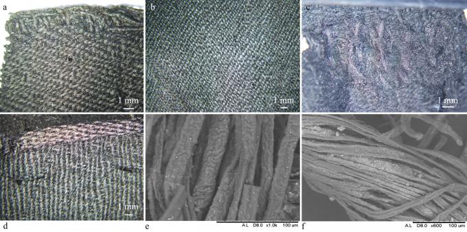 The fibres constituting the textile surface have an average diameter of 20 μm (min. 11 – max. 38 μm) and show prominent cuticular scales with smooth edges. Occasional elements with a diameter greater than 38 μm exhibit the disappearance of the central medulla. The sewing threads show fibres that are more degraded than those used for the fabric structure.