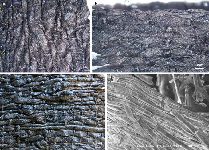 The textile surface appears highly irregular and rather coarse, due to the marked difference in thread diameter between the warp and weft systems. The weft shows irregular dimensions, some thinner threads measuring approximately 0.74–0.78 mm in diameter. Surface irregularity is further enhanced by occasional overlapping of weft threads and by the presence of knots, at which points the threads become thinner and reduced in size. These knots were likely introduced to repair threads that broke or were damaged during weaving.