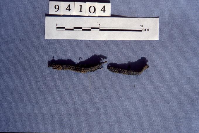 Blue fabric, presumably tabby, now entirely disappeared, but represented by 3 lengths of reinforced selvedge